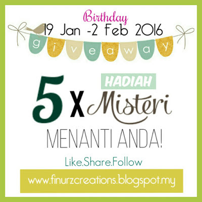 Birthday Giveaway by Finurz Creations 2016 January 25, 2016 By alyachan 9 Comments Assalamualaikum. Annyeong guys! Jom kita join GA ni ramai ramai. klik banner untuk join... TAMAT 2 FEBRUARI 2016 Dapatkan pelbagai buku di sini, beli online sahaja. SENANG! Diskaun 50% Buku Terpilih Share This Story Share on Facebook Share on Twitter Pin this Post Newer Post Older Post You Might Also Like 9 comment nur husnaJanuary 26, 2016 at 10:53 PMGoodluck ;)ReplyDeleteRepliesalyachanJanuary 27, 2016 at 12:04 PMterima kasih :DDeleteRepliesReplyReplyCikla ShahrilJanuary 26, 2016 at 10:59 PMGood luck .. Cikla dtg dr segmen sama... Bls kunjungan awk.. ReplyDeleteRepliesalyachanJanuary 27, 2016 at 12:05 PMterima kasih :D goodluck DeleteRepliesReplyReplyaienienkaJanuary 26, 2016 at 11:17 PMsinggah dr segmen sama.. thnx for singgah. :DReplyDeleteRepliesalyachanJanuary 27, 2016 at 12:06 PMterima kasih :D goodluck DeleteRepliesReplyReplyshida jamal ♡January 27, 2016 at 12:40 PMHai :) shida singgah sini hihi all the best yeReplyDeleteRepliesalyachanJanuary 27, 2016 at 8:41 PMterima kasih shida:DDeleteRepliesReplyReplyalyachanJanuary 27, 2016 at 8:42 PMterima kasih :DReplyDeleteRepliesReplyAdd commentLoad more... Terima kasih :)